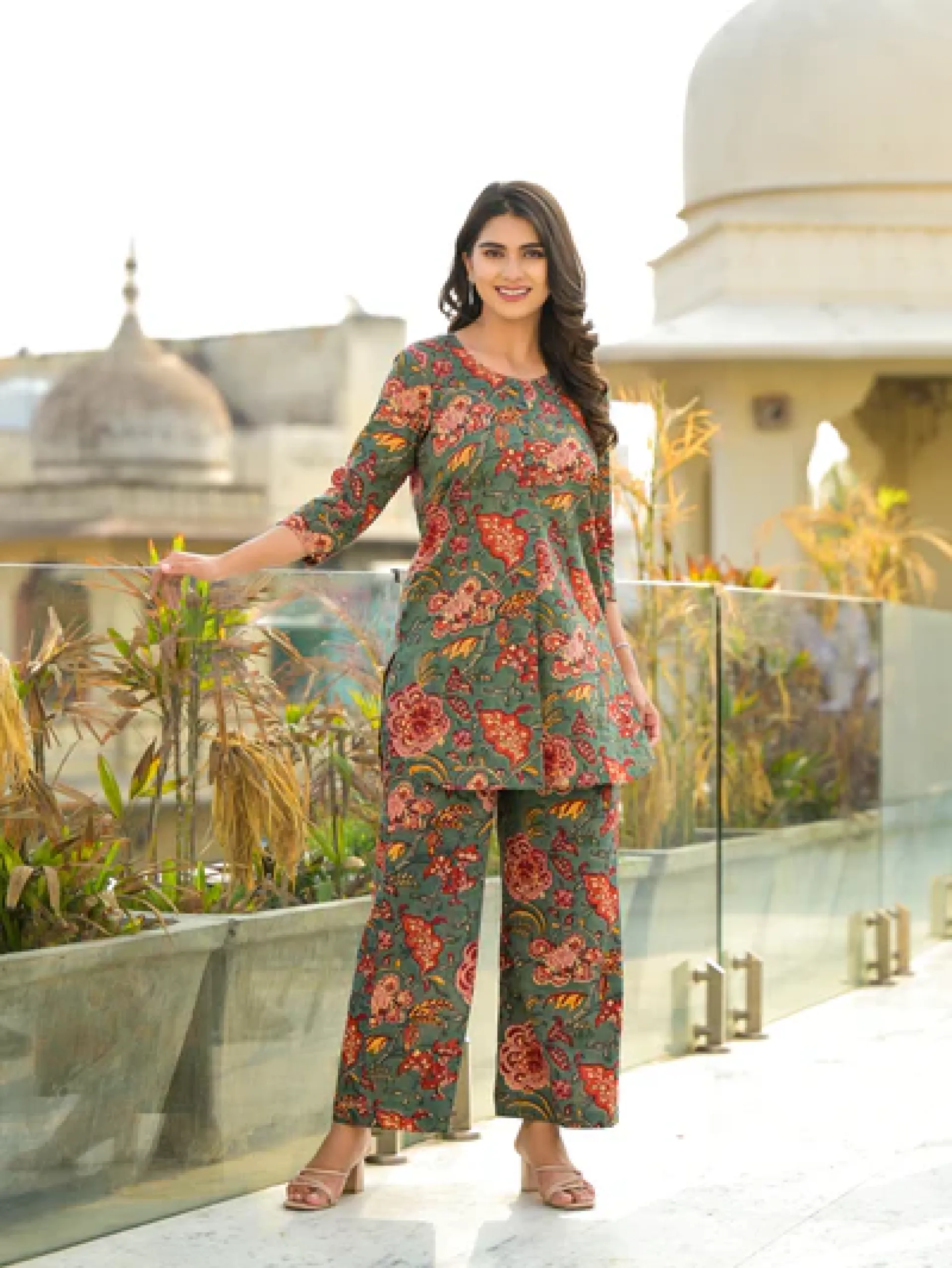 Get ready to bloom in our Desi Bloom Handblock Cotton Floral coord set! Made with comfortable and breathable cotton, this set is perfect for any occasion. The handblock print adds a fashionable touch, making you stand out in style. (Don't forget to stop and smell the flowers, too!)