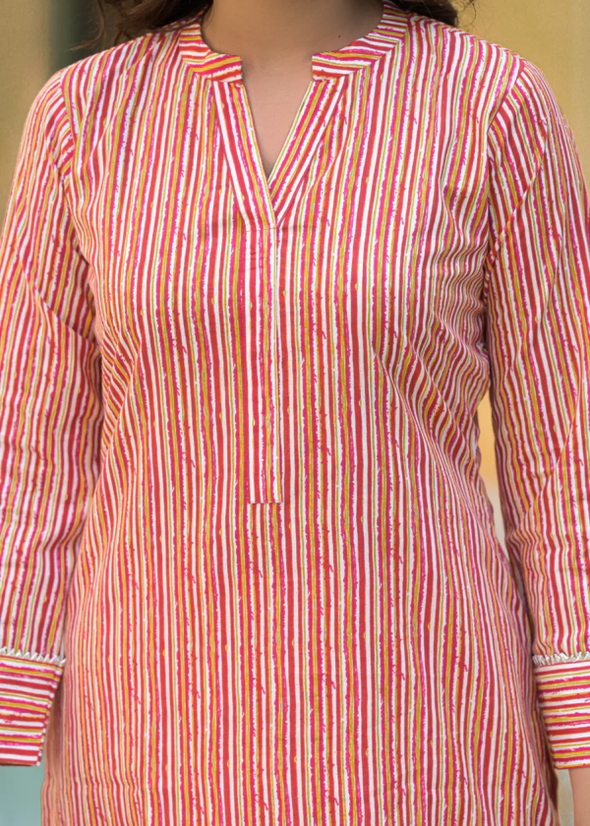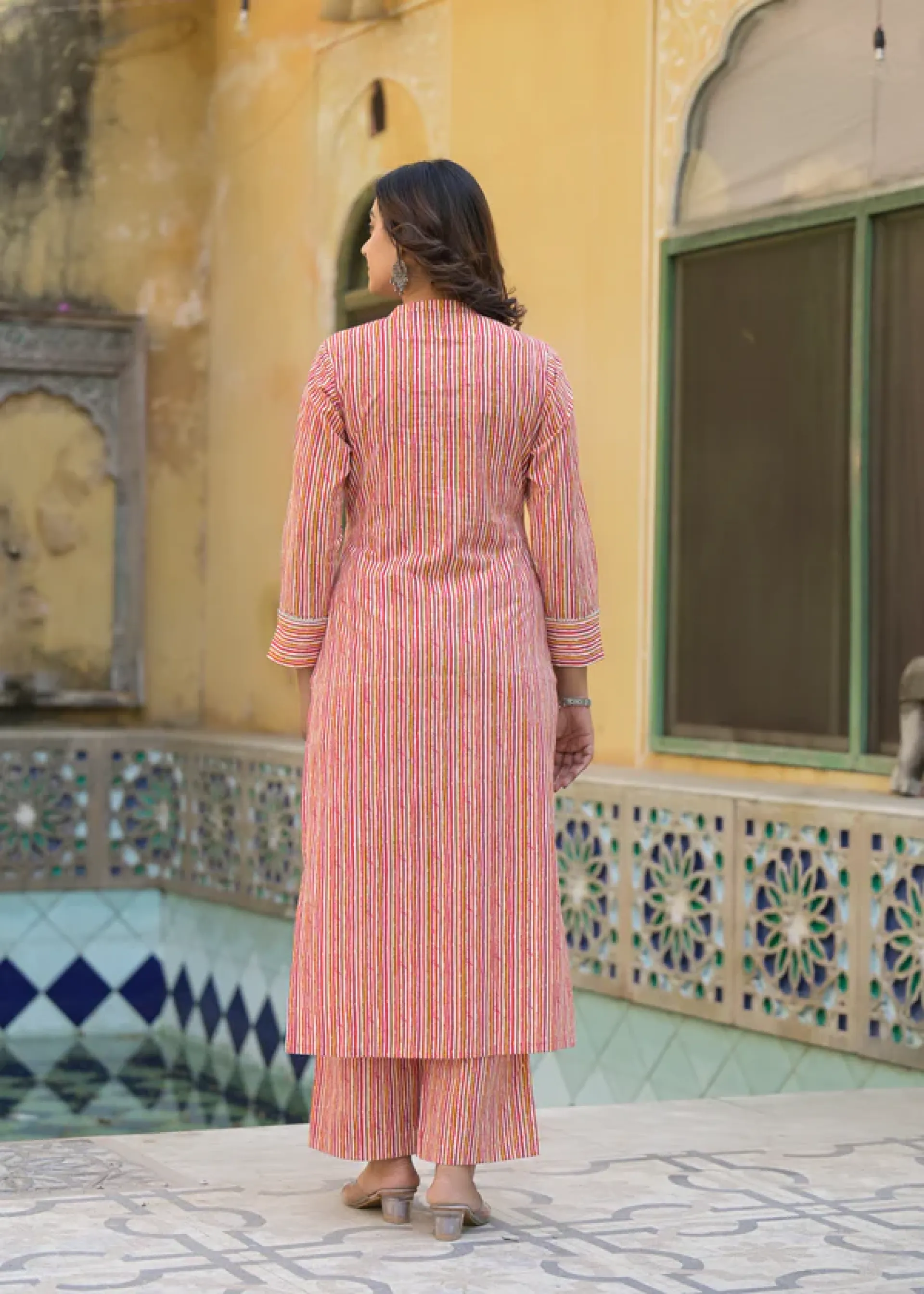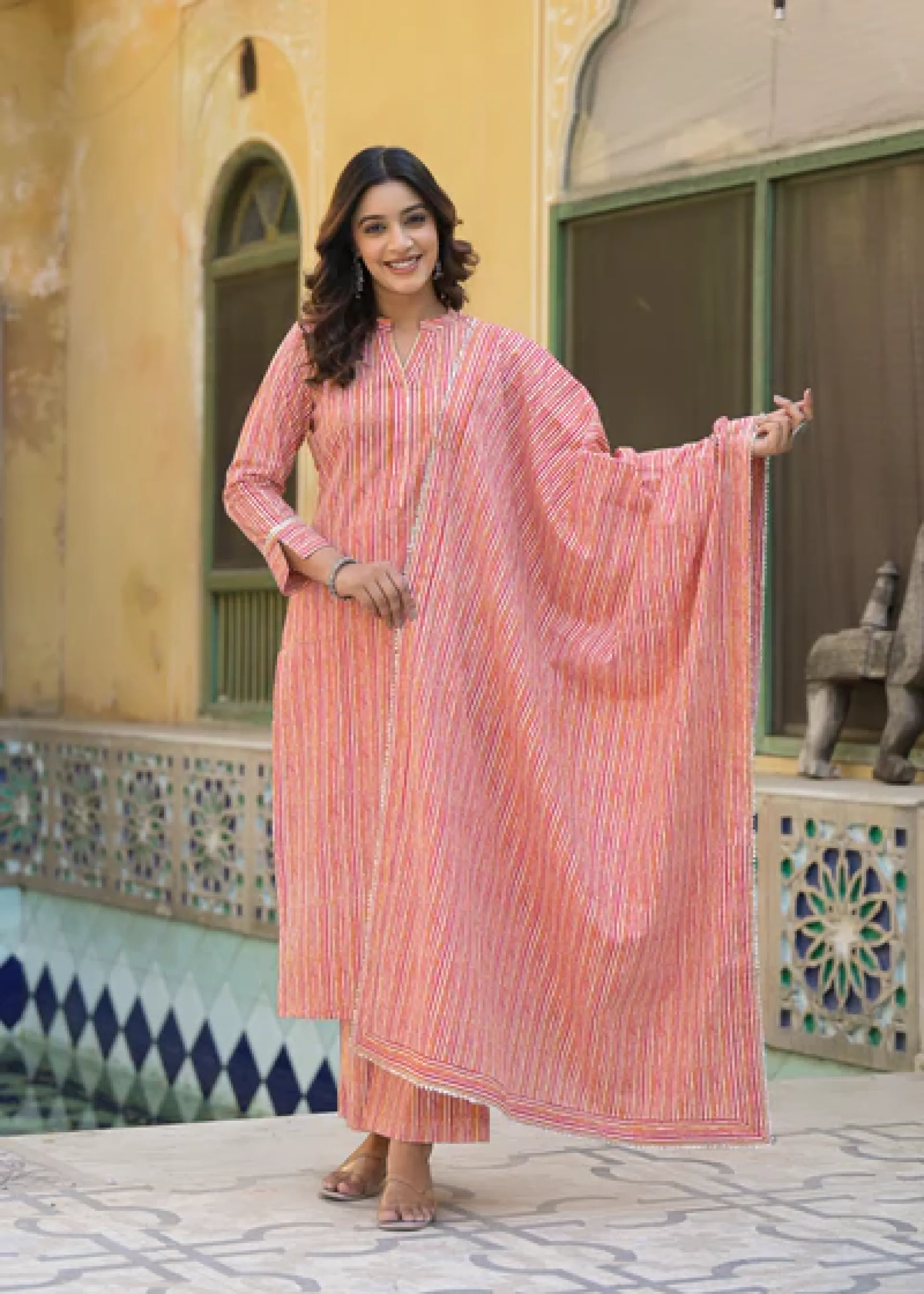Elevate your wardrobe with our Rangeela stripes pink  printed cotton suit set with dupatta. Immerse yourself in the intricate  adding a touch of art to your ensemble. Crafted from premium cotton, experience luxurious comfort while looking effortlessly chic.