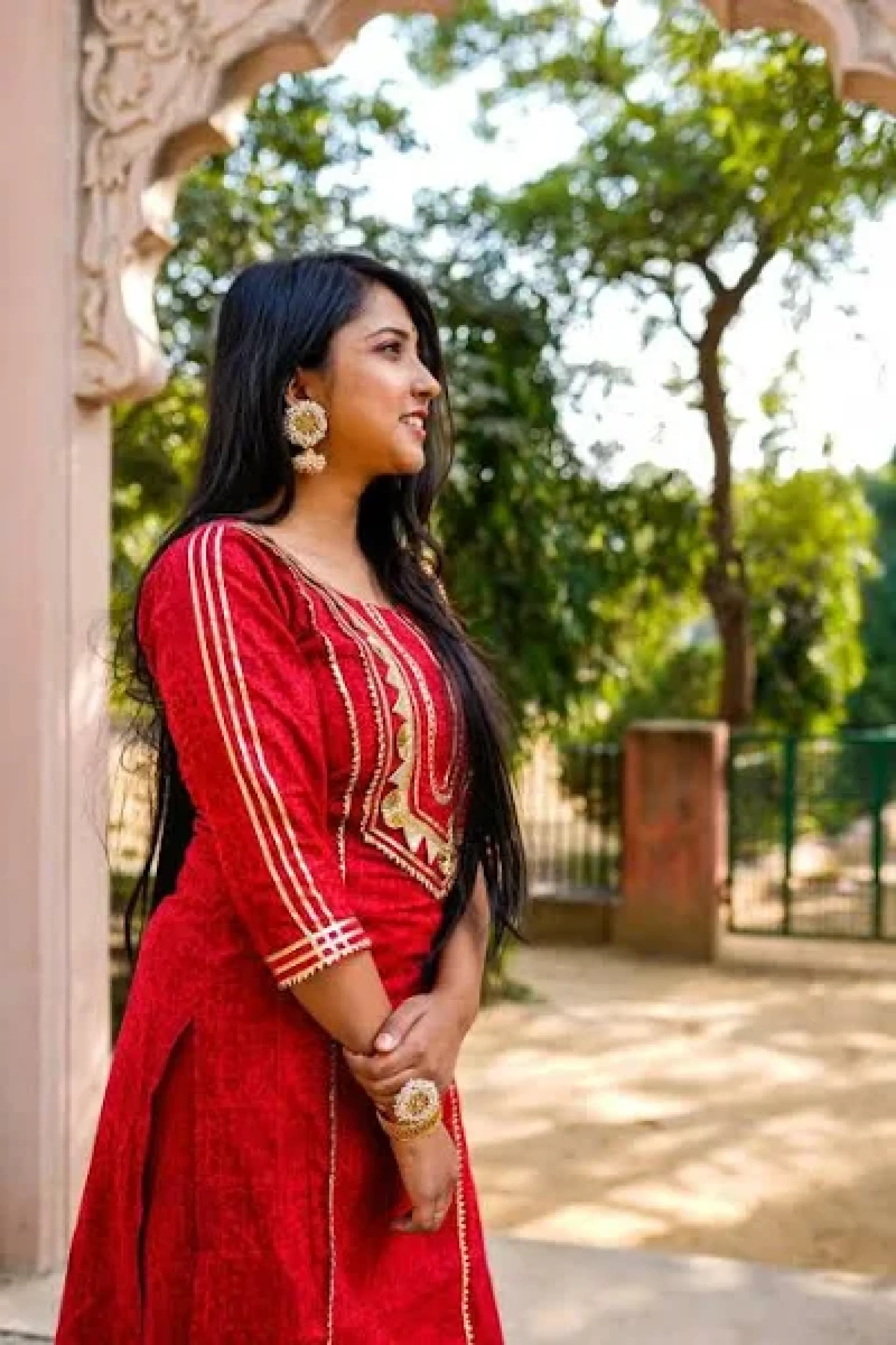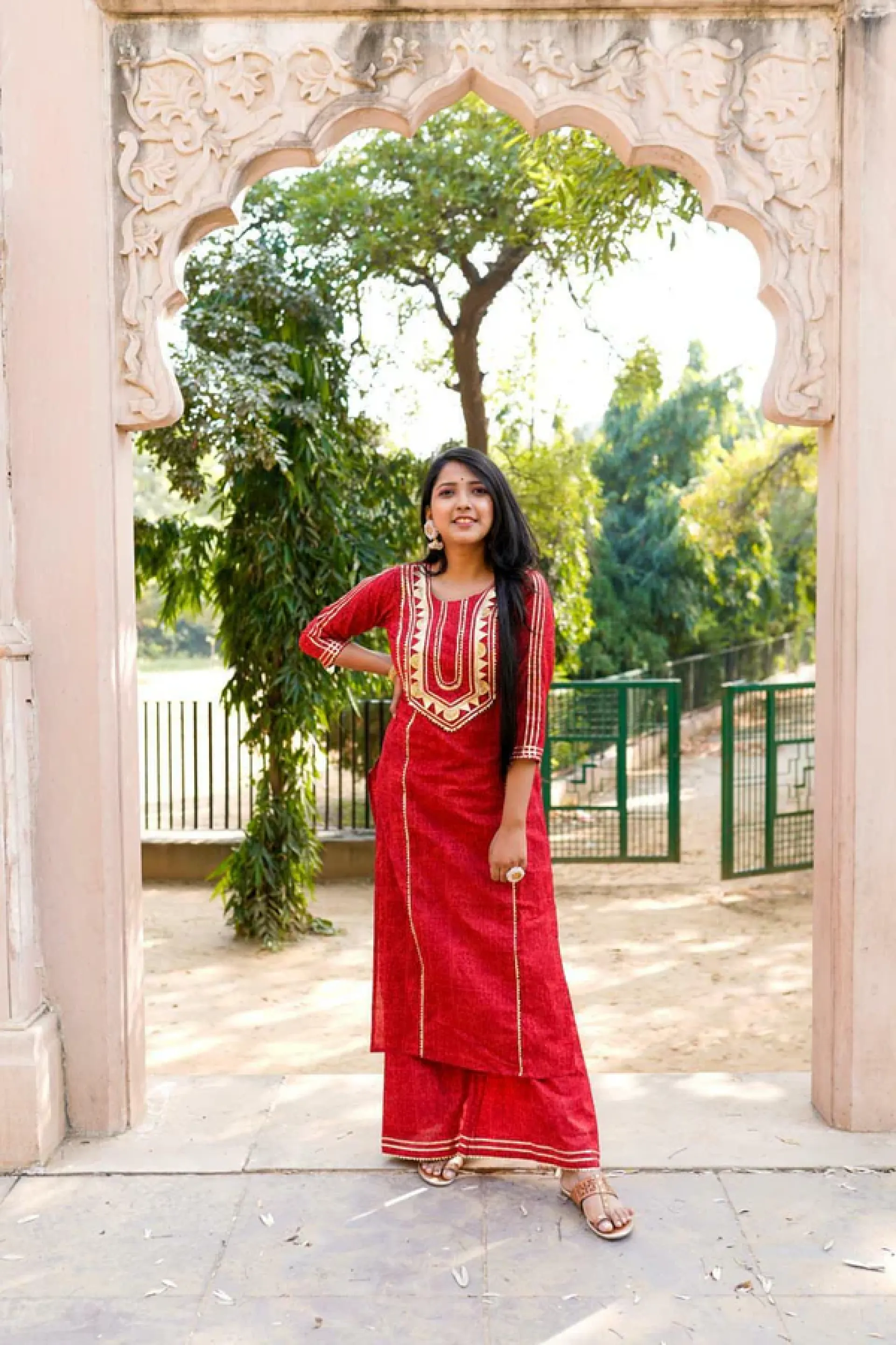 Get ready to stun at any festive occasion with our Red Festive edit Self Print Kurta and Palazzo set. The Gota work adds the perfect touch of traditional elegance to this red ensemble, making you stand out in any crowd. Embrace your unique style with this playful and quirky set.