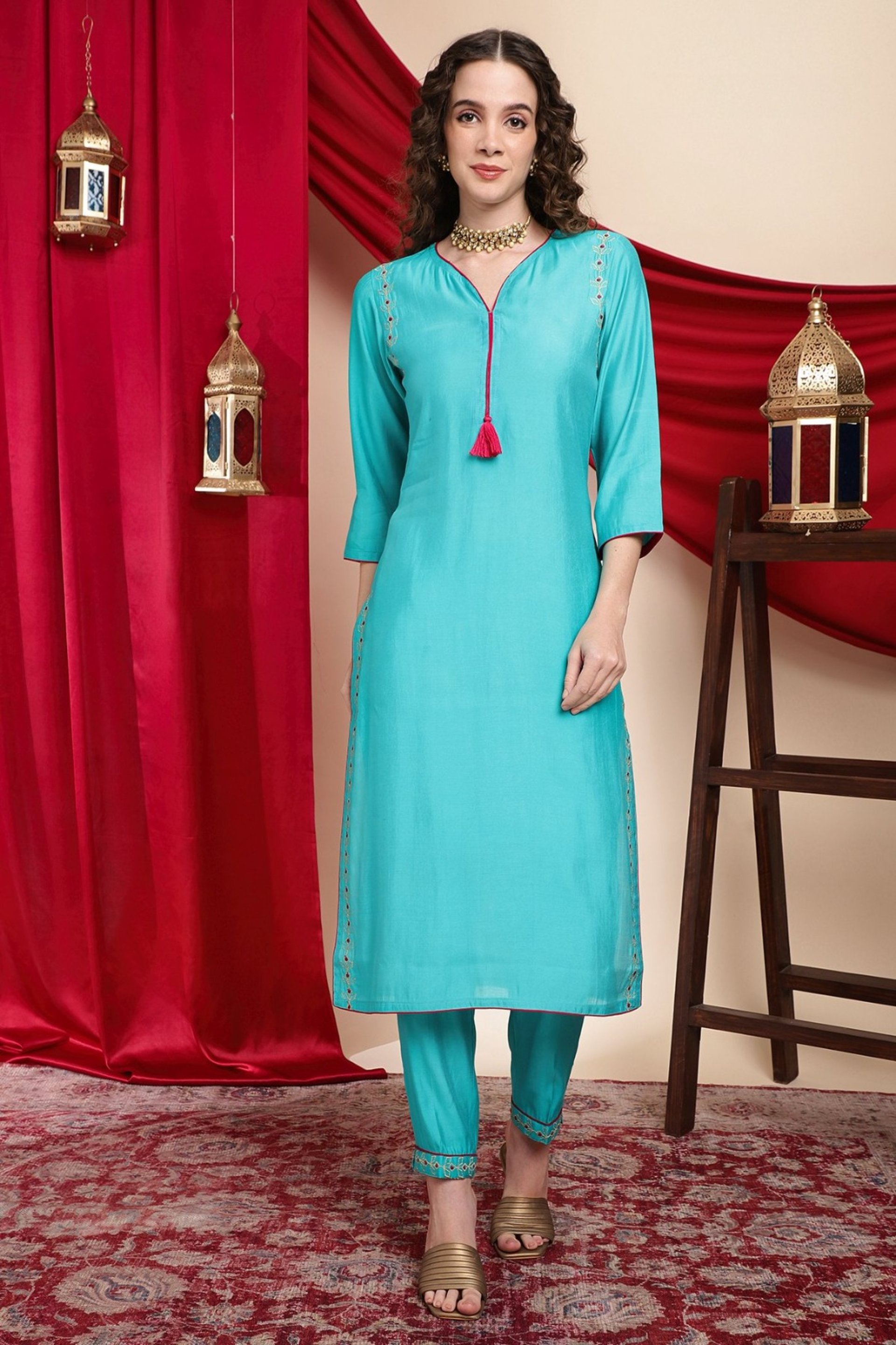 Refresh your ethnic wardrobe with this aqua blue straight-cut cotton kurta set. Featuring a V-neck with tassel tie-up, delicate thread work on the shoulders, and comfortable straight pants with embroidered hems — it’s the perfect blend of simplicity and grace. Ideal for daily wear, work, or a casual lunch outing.