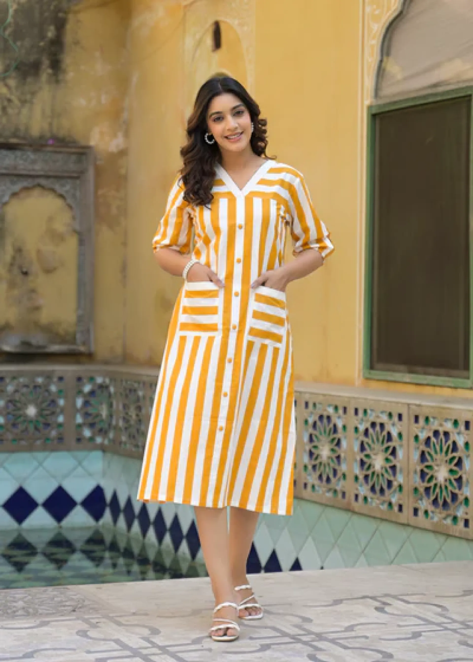Indulge in the beauty of printing with our Mango Yellow Printed Cotton Dress. Made from premium quality cotton, this dress features a vibrant mango yellow color and intricate prints, making it a must-have for any fashion enthusiast who appreciates unique and artisanal craftsmanship. Elevate your wardrobe with this luxurious and exclusive piece today.